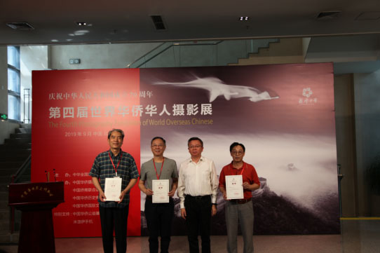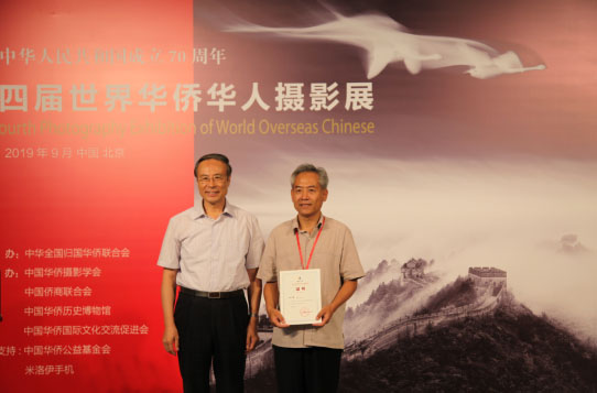 (中國僑聯顧問、中國華僑攝影學會會長王宏、攝影展支持單位米諾伊手機董事長盧寒為佳作獎獲得者代表頒獎)