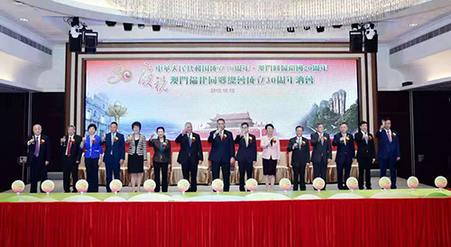 10月15日,由澳門福建同鄉總會主辦的“慶祝中華人民共和國成立七十周年、澳門回歸祖國二十周年、澳門福建同鄉總會成立三十周年”慶祝酒會在澳門旅游塔隆重舉行,澳門特區行政長官崔世安、全國政協副主席何厚鏵、中央駐澳門聯絡辦副主任張榮順、福建省政協主席崔玉英、中國僑聯副主席隋軍等共同主禮,與海內外閩籍鄉親約500人共襄盛舉。