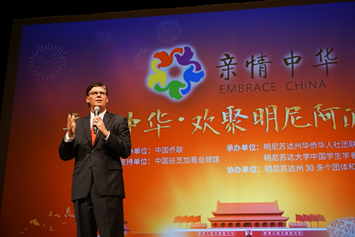 當地時間10月13日晚,中國僑聯“親情中華”藝術團在此次慰僑巡演的第四站明尼阿波利斯,為千余名華僑華人和被吸引前來的當地觀眾獻上一場盛大的文藝演出!坝H情中華”藝術團團長、中國僑聯文化交流部部長劉奇,中國駐芝加哥總領事館僑務組長盧曉輝,明尼蘇達州參議員艾瑞克·普瓦特,美國國會議員丁·菲利普的社區代表索耶爾等出席演出。