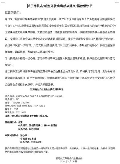 在加拿大,善行義舉溫暖人心,加國華人情牽疫區,加拿大愛心慈善基金會、加拿大揚州同鄉會等僑團紛紛行動起來捐錢捐物,累計捐款200人次,總金額超60萬,采購急需醫用消毒液1萬瓶;加拿大江蘇華人聯合總會徐凌女士聯合長江醫藥集團在海外發起募捐行動,短短的兩天時間,就辦妥募捐、尋找醫護用品、開通東航在洛杉磯的航空綠色通道等事宜。在德國,德國江蘇總商會會長王榮虎博士以及各位理事發出捐款捐物倡議,并提供歐元、人民幣、物品三條捐助渠道。在安哥拉,各種應急物資從海外源源不斷地送回國內。在菲律賓,江蘇商會會長譚志向盱眙縣捐贈5000只口罩。在日本,旅日華人中島毅在朋友圈一看到省華僑公益基金會的倡議,就立即通過微信轉賬1000元。在巴西,巴西巴中經貿交流會方激女士,第一時間捐贈10000元……還有很多來自加拿大、美國、日本、巴西、安哥拉、埃及、肯尼亞等國的江蘇籍海內外僑胞紛紛來電咨詢、接洽捐款捐物相關事宜。