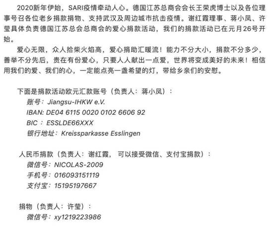 2020新年伊始,新型冠狀病毒感染的肺炎疫情,始于武漢,牽動萬家,舉世關注,讓這個庚子鼠年的春節顯現得那么不平凡!拔覀冊谶@兒過年,你們卻在幫我們過關!”武漢以及全國各地醫務人員為打贏這場防疫防控戰正奮斗在一線!案綦x病毒,但絕不會隔離愛!”疫情的發展和同胞的安危同樣牽動著海內外僑胞的心!1月26日,江蘇省華僑公益基金會發出倡議:江蘇籍海內外僑團和海外僑胞、歸僑僑眷行動起來,為疫區捐贈款物,特別是醫用耗材、防護用品等。