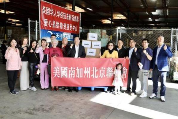 2020年2月,美國南加州北京聯誼會的干部與會員在捐獻物資現場。(美國《僑報》/邱晨 攝)