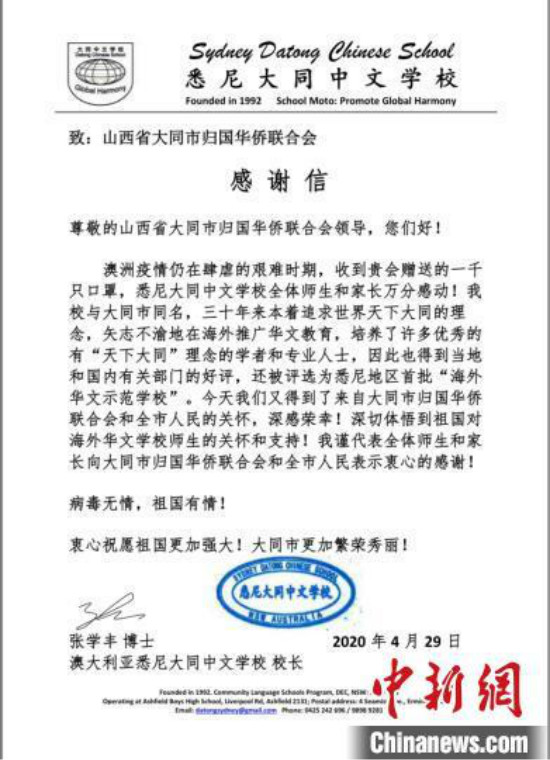 中新網太原5月4日電 題:一封來自澳大利亞華校的感謝信:大同你好 天下大同