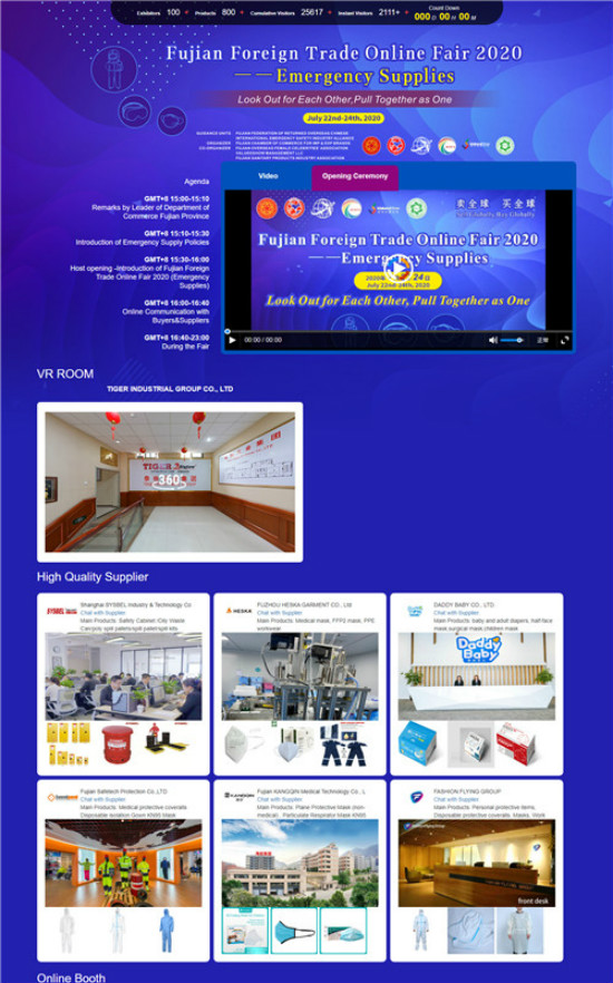 本次云展會作為扎實做好“六穩”工作、落實“六!比蝿盏囊豁椫匾獎撔屡e措,旨在搭建全球應急物資供需線上精準對接平臺,助力福建企業復工復產。開幕啟動儀式設福州主會場,并連線北京、深圳、泉州三地,共邀請100余家福建應急產品生產商和上千家境外采購商在線參展,吸引海內外各界近3000人在線參與。聯合國工業發展組織中國南南工業合作中心主任郭力、國際應急安全產業聯盟執行秘書長李欽祥、中國巴新友好聯合會副主席潘郁、福建省衛生用品商會會長林斌、晉江恒安家庭生活用紙有限公司經理黃俊鵬在線參與互動。