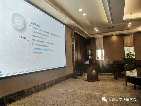包含麗做中國華僑華人研究院(溫州大學)基地建設情況報告。介紹了研究院近年來在人才隊伍建設、基地建設、研究領域等方面的重要舉措和顯著成效。她表示,近年來,華僑華人研究院(溫州大學)基地在上級僑務部門和溫州大學黨委領導下,各項工作取得了階段性成效。她指出,下一階段研究基地將圍繞“基地課題培育”“調研基地建設”“主題圖書資料室建設”等九個方面,開展僑鄉歷史文化、跨境移民、華文教育和僑務工作等領域的研究,以扎實的工作成效,助推學校服務浙江經濟社會高質量發展和浙南閩北贛東地區高等教育事業內涵式發展。