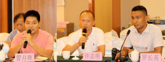 省海歸協會會長管月暉(左),美國海南商貿總會執行主席許志明(中),?谑心蟽S機工眷屬聯誼會會長羅長英(右)在座談會上踴躍發言