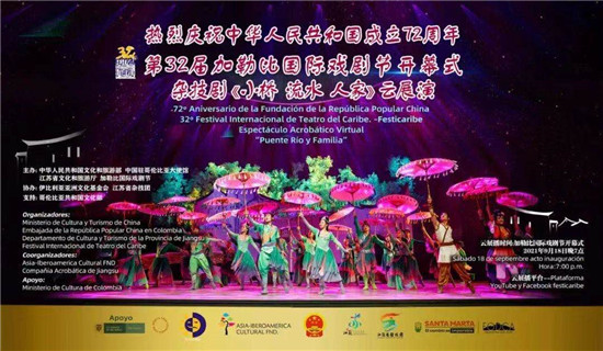 9月18日晚黃金時間,中國駐哥倫比亞大使館和哥倫比亞文化部,聯合在哥倫比亞國家電視臺、第32屆加勒比國際戲劇節開幕式上,共同舉辦“江蘇省華僑文化交流基地”江蘇省雜技團創作的雜技劇《小橋流水人家》國慶系列云首演,掀開了中華人民共和國成立72周年暨中哥建交41周年系列獻禮活動。CGTN西班牙語部、中國文化網等中哥機構和媒體的電視端、官網及YouTube、Facebook等新媒體賬號同步播出。中哥各界民眾與加勒比地區26萬觀眾和粉絲,歡聚云中,好評如潮。