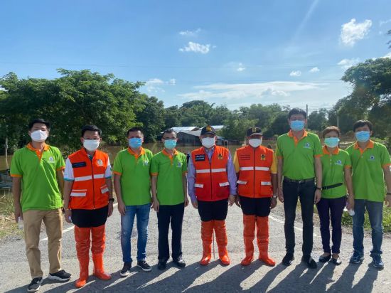 抵達信武里府時,府尹率當地官員迎接并帶領救災小組深入災區。由于連日暴雨,路面積水超過一米,必須劃船進入,期間各救災人員也有趟著水走進去,洪水沒過小腿,接近淹到人的腰部。