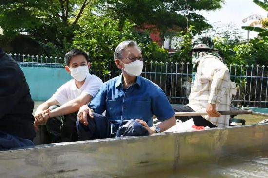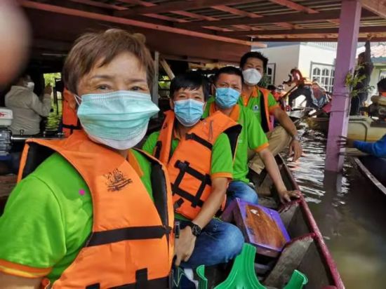 泰國泉州晉江聯合總會會長蔡上新、執行會長陳俞龍、副會長許清流、洪世界、張孚杰、常務理事黃淑芬、顧問許宗會乘小船進入災區