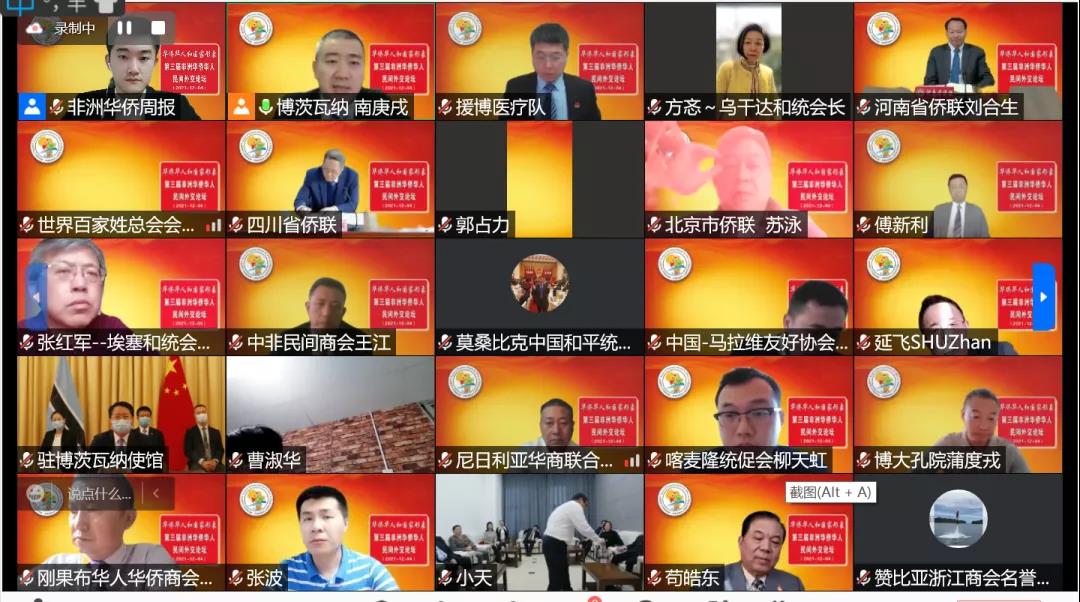 第三屆非洲華僑華人民間外交論壇以線上線下相結合的方式舉行。中華人民共和國駐博茨瓦納特命全權大使王雪峰,黑龍江、北京、四川和河南等省市僑聯領導,全國友協、中非民間商會負責人和非洲研究專家學者出席論壇。論壇圍繞“華僑華人和國家形象”主題,就團結抗疫、中非合作、綠色發展、在非中國企業社會責任、反對種族主義和維護中國和平統一等領域相關議題,開展了富有建設性的對話,共同總結中國民間外交的實踐經驗與理論成果,探索中非民間外交發展的新思路、新方法,從而多層次、多方位、全方位地推進新時代中國特色大國外交的發展。會議最后還通過了《2021 中非民間外交倡議書》。