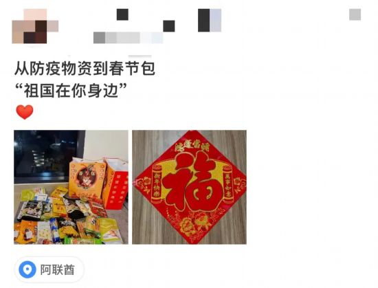 “祖國牽掛著每一名海外中國公民的生命安全和身體健康,始終把大家安危冷暖放在心上!1月25日,中國駐利比亞使館留守組向在利同胞發放“春節包”。