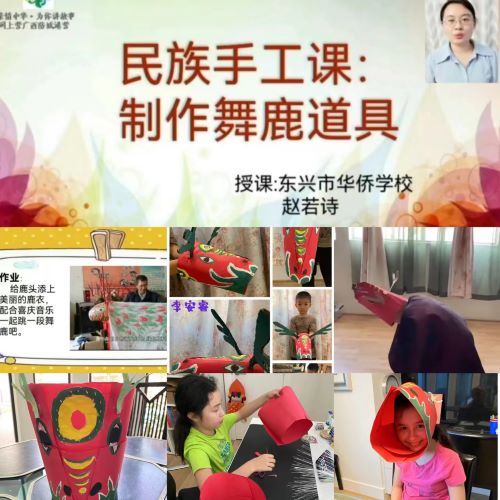 直播課上,營員們通過老師的講解,了解到“舞鹿”文化是上思壯族兒童每年農歷“三月三”進行的一種民俗傳統活動,寓意祈禱家人健康長壽、福祿綿延!拔杪埂北硌輹r,鼓、镲和鑼等樂器敲打出的音樂節奏明快強烈,營員們紛紛用手跟著打起了節拍,還有營員大膽發揮想象,巧用生活用品表演了“舞鹿”的節奏。在老師的指導下,營員們親自動手制作了“舞鹿”的道具——鹿頭,還用自己制作的道具進行了“舞鹿”表演,全身心沉浸在歡樂的節奏中。