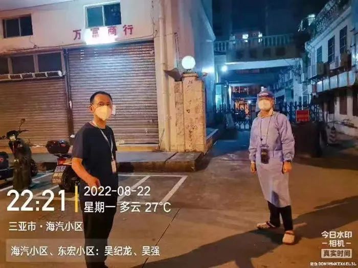 海南省僑聯志愿者曹玉洲、吳紀龍夜間在海汽小區、東宏小區巡邏