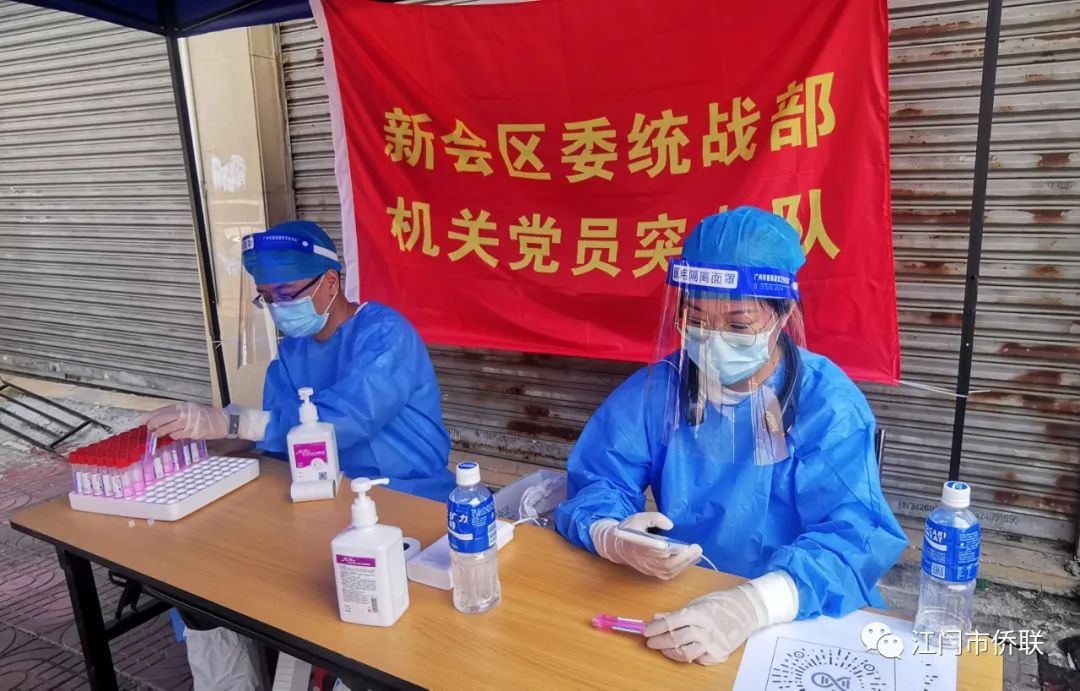 新會區僑聯所有黨員干部、工作人員聞令而動、迅速響應,立即前往中心影劇院前小廣場、河南社區核酸檢測點進行支援。黨員干部、工作人員換上防護服、戴好防護裝備,各司其職,堅守崗位,協助醫護平穩有序地進行核酸檢測工作。