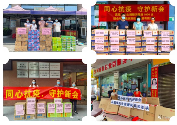 新會區僑聯名譽主席及委員等僑界代表(按姓氏筆畫排序):田漢華先生(澳門新會大澤同鄉會監事長)、馮嘉強先生(香港司前同鄉會理事長)、莊一霖先生(新會區環球青年協會副會長)、劉力仍先生(澳門新會大澤同鄉會會長)、麥群裕先生(伯利茲中國和平統一促進會會長)、陳素燕女士(澳門江門同鄉會副會長)、高思文先生(香港新會同鄉會監事長)先后捐贈了一批價值13.8萬元的消毒液、藥品、風扇、冰塊、清涼飲料,提供車輛運送抗疫物資,支持家鄉人民抗擊疫情。