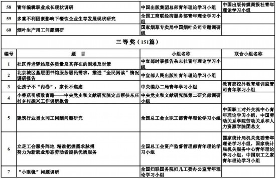 經各部門機關黨委推薦、有關科研機構復評和領導專家終評,最終評選產生了251篇優秀調研成果,其中特等獎10篇(并獲“十佳調研報告”稱號),一等獎30篇,二等獎60篇,三等獎151篇。獲獎名單如下: