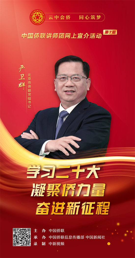 1月18日,以“學習二十大·凝聚僑力量·奮進新征程”為主題的中國僑聯講師團(第七期)網上宣介視頻正式上線。視頻旨在深入學習貫徹習近平新時代中國特色社會主義思想,深入學習宣傳貫徹黨的二十大精神,深刻領悟“兩個確立”的決定性意義,增強“四個意識”、堅定“四個自信”、做到“兩個維護”,進一步加深對習近平新時代中國特色社會主義思想的領悟,加強對馬克思主義中國化時代化、中國式現代化、全面從嚴治黨等重大問題的認識,深刻理解黨的二十大對全面建設社會主義現代化國家作出的戰略部署,在僑界興起學習宣傳貫徹熱潮,把思想統一到黨的二十大精神上來,把力量凝聚到黨的二十大確定的各項任務上來。