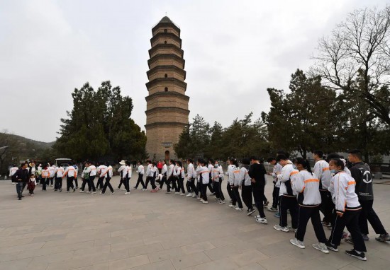 參觀者在陜西延安寶塔山參觀(2021年3月30日攝)。新華社記者 張博文 攝