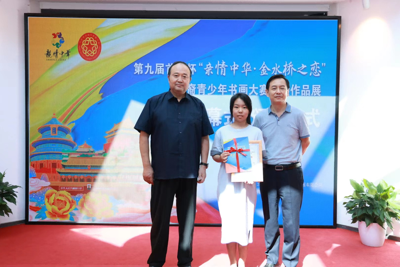 7月25日,第九屆首開杯“親情中華·金水橋之戀”華裔青少年書畫大賽獲獎作品展開幕式暨頒獎儀式,在北京中軸線南端、永定門城樓旁十月文學院隆重舉辦。中國僑聯文化交流部部長劉奇,北京市僑聯黨組書記嚴衛群,北京首開集團黨委副書記李曉莉,中國國畫研究院、濟南大學美術學院院長陳忠洲,北京出版集團十月分公司總經理助理文爽,北京大河盛世文化傳媒發展有限公司董事長何雷以及書畫大賽獲獎代表,“中國尋根之旅”夏令營北京朝陽營、海淀營營員參加。北京市僑聯黨組成員、副主席蘇泳主持儀式。