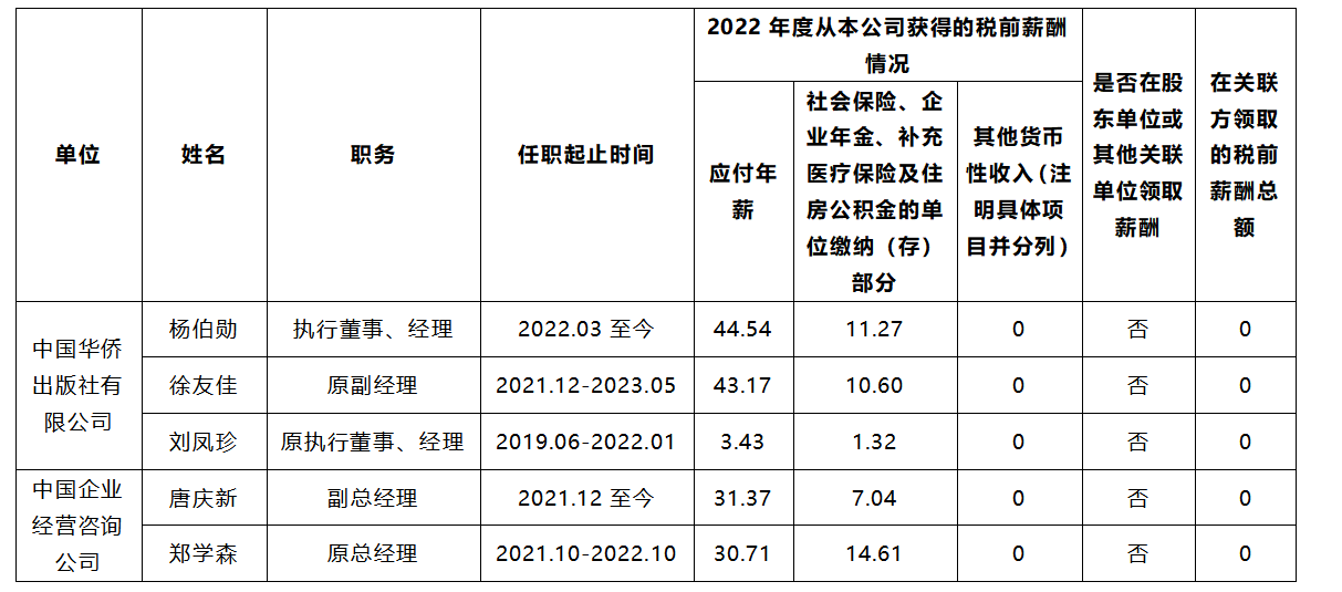 中國僑聯直屬企業負責人2022年度薪酬信息披露