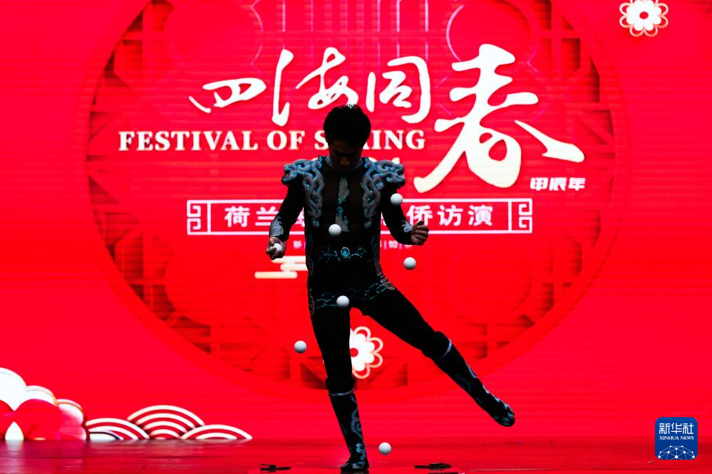 2月24日,演員在荷蘭海牙舉行的“四海同春”慰僑訪演活動上表演雜技。新華社記者 孟鼎博 攝