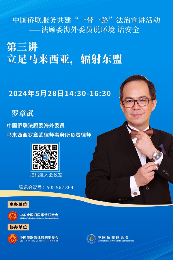 第三講將于2024年5月28日下午14:30正式開播,由中國僑聯法顧委海外委員馬來西亞羅章武律師主講。羅章武律師畢業于澳大利亞莫納什大學,主修法律和商科,專長為公司商法、銀行法、房地產法和商標法,是亞洲國際仲裁中心、中國國際經濟貿易仲裁委員會、北京國際仲裁中心、海南國際仲裁院等多家國際仲裁機構的仲裁員。2016年,羅章武律師牽頭創立了馬來西亞-中國法律聯合會,組織志愿律師和馬來西亞法律系大學生為海外僑胞提供法律志愿服務,及時處理中國游客、留學生、務工人員和中資企業在馬來西亞面對的法律問題,解答12308中國外交部領事保護應急熱線涉及馬來西亞法律問題的求助電話,得到在馬僑胞和中資企業廣泛好評。