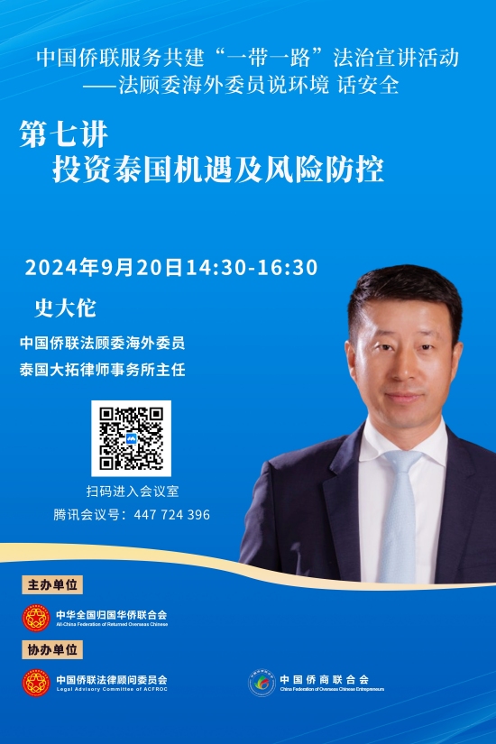 第七講將于2024年9月20日(周五)14:30開播,由中國僑聯法顧委海外委員泰國史大佗律師主講。史大佗律師畢業于英國倫敦城市大學,主修國際商法,于2014年在泰國創辦泰國大拓律師事務所并任主任,同時擔任泰國中華總商會常務會董兼法律顧問、泰國中國企業總商會副主席兼法務部主任、泰國山東總商會會長。史大佗律師為超過1400家中資企業提供過法律服務,熟悉投資泰國路徑和框架搭建,以及如何避免投資誤區。