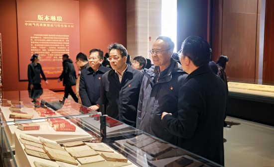 在講解員的引導下,萬立駿一行先后走進國家版本館文興樓、文華堂、文瀚閣、蘭臺洞庫等,參觀了“版本工藝”專題展、“斯文在茲——中華古代文明版本展”、“版本琳瑯——中國當代出版精品與特色版本展”與“真理之光——馬克思主義中國化時代化經典版本展”等專題展覽陳列,認真聆聽現場講解,頻頻駐足陳列柜前,仔細閱覽陳列展品,近距離領略典籍、版本凝聚的文化血脈和寄托的民族理想,深刻體悟到版本背后強大的文化生命力、文化感召力,感受馬克思主義中國化時代化的光輝歷程,真切感受到中華文化的深厚底蘊和中華文脈的時代價值。在參觀過程中,大家不時為中華民族博大精深的文化而感慨贊嘆。