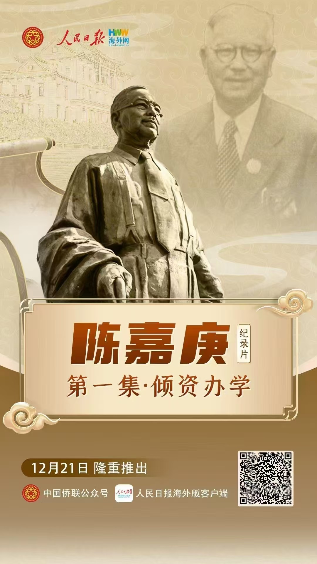 今年是陳嘉庚先生誕辰150周年,為深入貫徹習近平總書記2014年給廈門集美校友總會的重要回信精神,弘揚新時代嘉庚精神,激發僑心向黨、團結奮斗的強大力量,中國僑聯指導人民日報海外網拍攝制作了四集紀錄片《陳嘉庚》。第一集《傾資辦學》講述了陳嘉庚先生在海內外捐資助學、興辦教育的感人事跡。