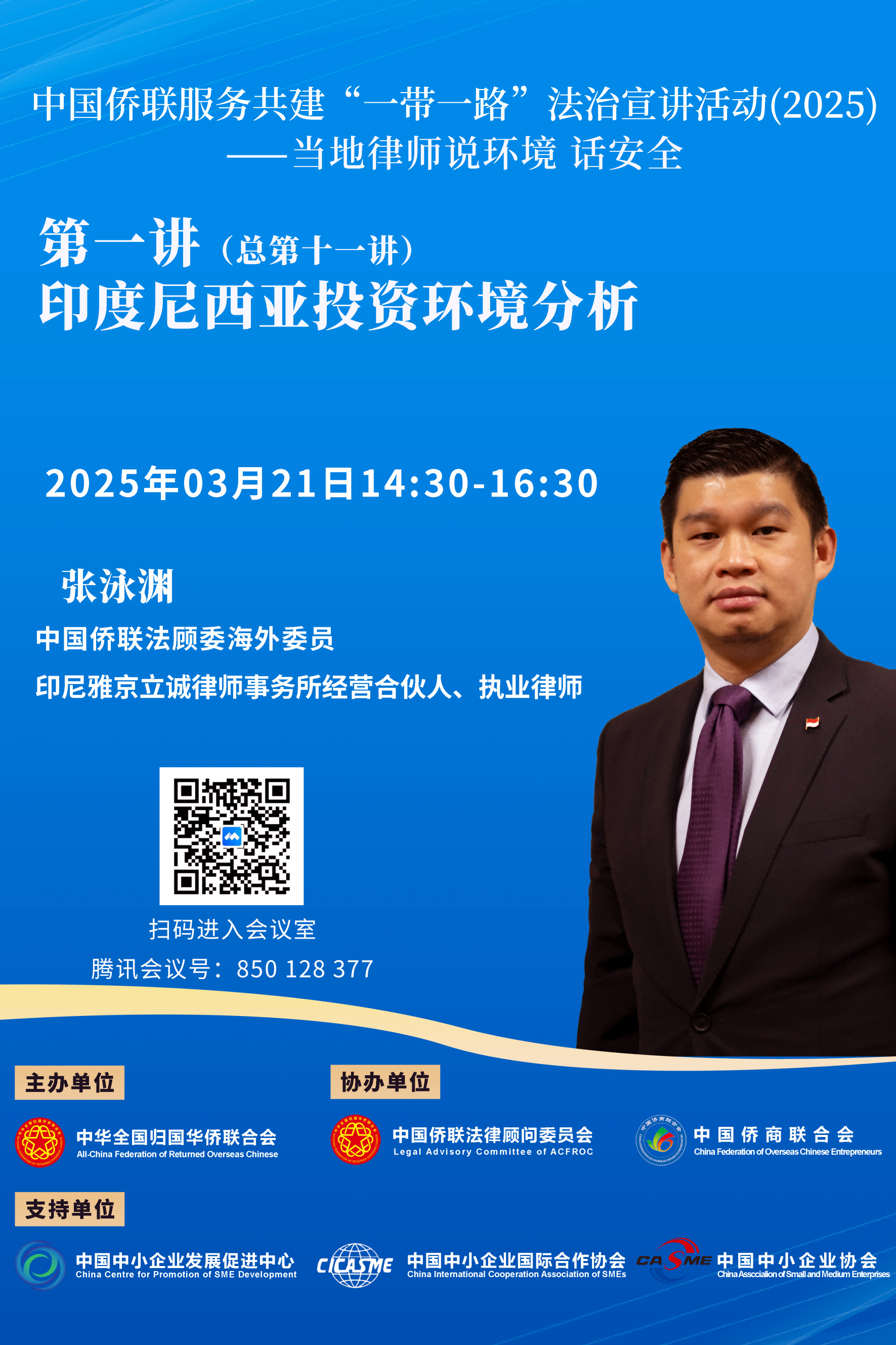 今年第一講(總第十一講)將于2025年3月21日(周五)14:30開播,由中國僑聯法顧委海外委員印度尼西亞張泳淵律師主講。張泳淵律師是印尼第四代華人,祖籍福建龍巖,先后畢業于印尼Azzahra大學和Pelita Harapan大學,專長為民事、刑事、能礦資源、不正當競爭及反壟斷、金融、衛生、會計等,是印尼雅加達雅京立誠律師事務所經營合伙人、執業律師。2019年至2023年,張律師帶領雅京立誠律所連續五年進入印尼全國 100大律所排行榜。張律師長期為在印尼的中資企業和中國公民提供法律咨詢和幫助,并致力于促進印尼與中國的法學交流。張律師于2018年受聘為中國僑聯法顧委海外委員,于2019年擔任印尼就業法典的備案審查專家,于2021年擔任印尼金屬和煤炭礦業法操作細則的備案審查專家,同時擔任印尼律師協會維護律師權益部副部長、印尼能礦律師協會律師維權權益部長。