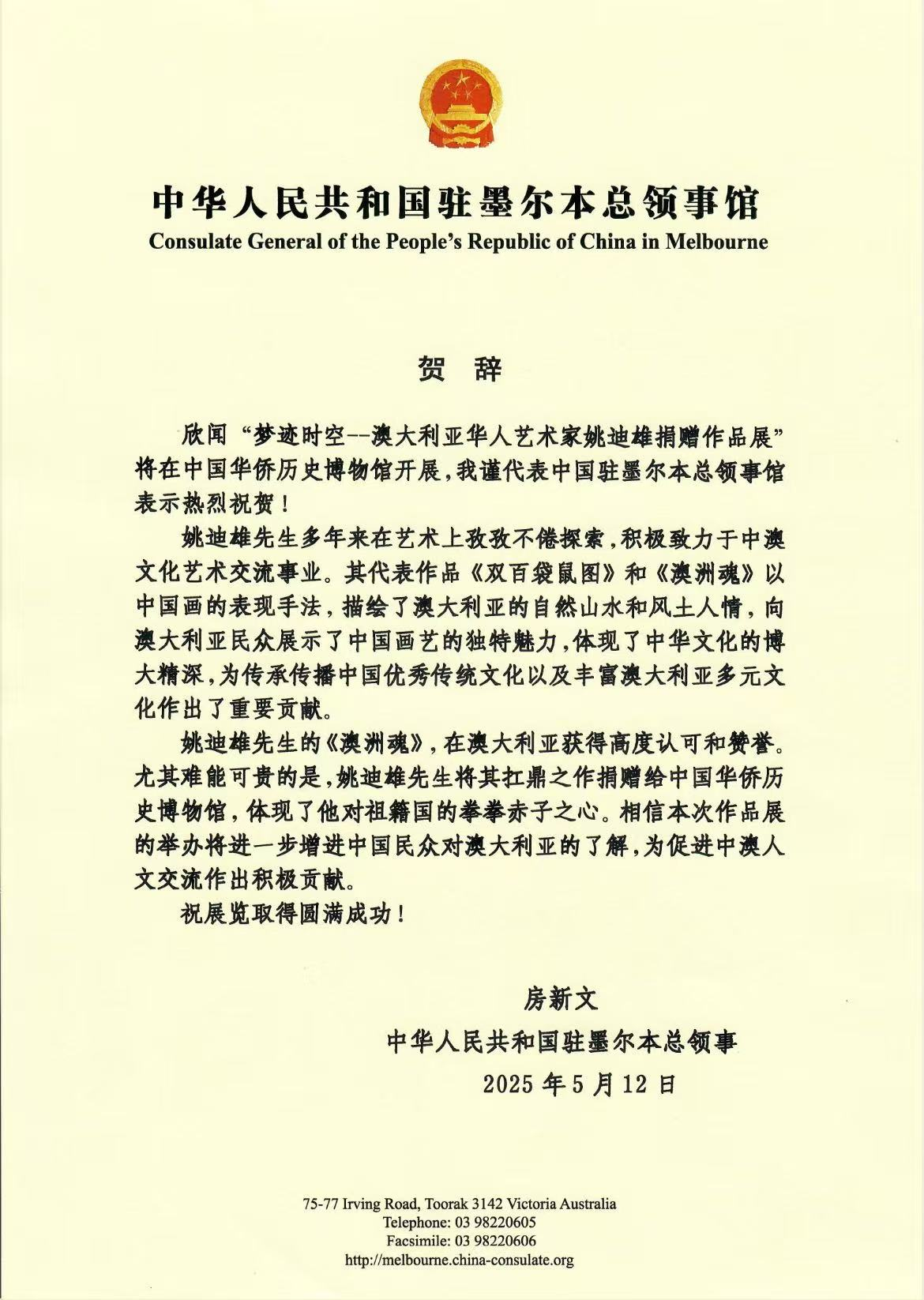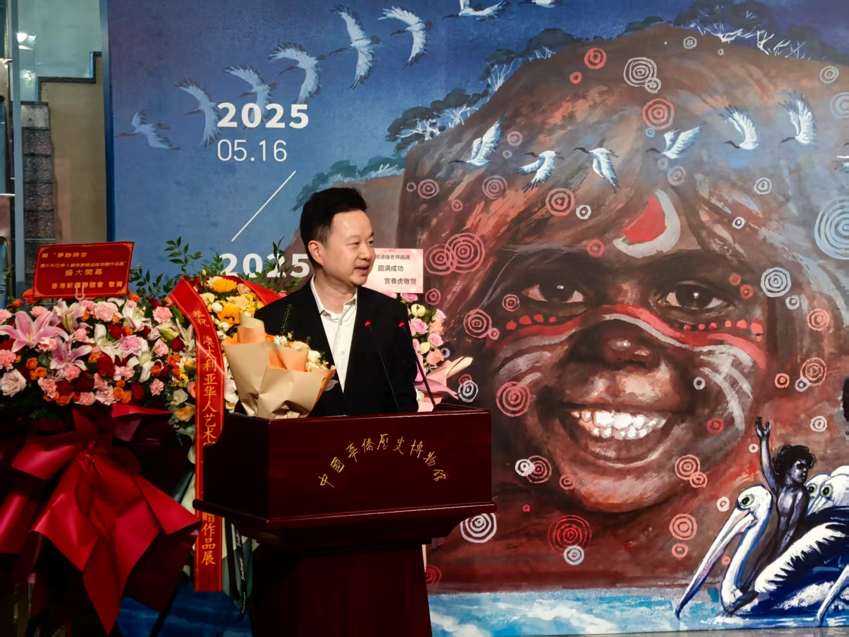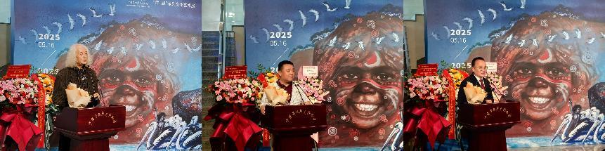 寧一在致辭中表示,“夢”是人類前行的動力源泉,華僑華人有著自己獨特而宏大的夢想。華僑華人無論身處何方,都懷揣著家族興旺、家國繁榮的夢想。中國夢,凝聚著全體中華兒女的共同期盼,海外僑胞作為其中重要的一部分,以各種方式積極參與中國的發展,為實現中國夢貢獻自己的力量。構建人類命運共同體是全人類的共同夢想,通過藝術交流,我們能夠打破隔閡,促進不同國家、不同民族之間的理解與合作,攜手邁向人類命運共同體的美好未來。“跡”是個人的行跡與經歷,更是人類文明在世界上留下的印記。姚迪雄先生四十年來的跨文化創作歷程,不僅是他個人的成長軌跡,更是無數華僑華人在海外拼搏的縮影。他們在不同的國度,用自己的智慧和勤勞,為當地的發展貢獻力量,同時也將中華文化傳播到世界各個角落,在人類文明的長河中留下了獨特的印記。這些痕跡見證了華僑華人在百年未有的變局中,堅守文化根脈,積極融入當地社會的努力,成為世界了解中華文化包容性的重要窗口。“時”是最忠實的記錄者,時間見證了藝術家的成長與蛻變。姚迪雄先生在漫長的藝術生涯中,不斷積累、沉淀,其創作風格隨著時間的推移逐漸成熟。多年來,華僑華人作為中外交流的重要力量,在不同時期發揮著關鍵作用。他們促進了文化、經濟、科技等多領域的交流,藝術交流作為其中的重要組成部分,也在時間的推動下不斷發展、深化。“空”是空間,華僑華人作為跨越國界的使者,在不同的空間和文明之間架起了溝通的橋梁。《澳洲魂》長卷跨越了地域空間,展現出兩種文明在藝術空間中的對話。在現實生活中,華僑華人活躍于世界各地,將中華優秀文化的魅力傳遞到海外,同時也把海外先進的文化、理念帶回中國。他們在不同文明的空間中穿梭,促進中外文明的交流互鑒,讓不同的文化在交流中綻放光彩,實現“各美其美、美美與共”。