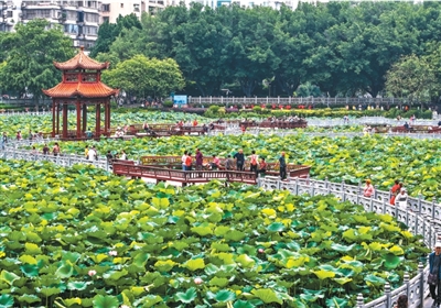 游客行走在廣西梧州市萬秀區潘塘公園廊道,賞荷游玩。