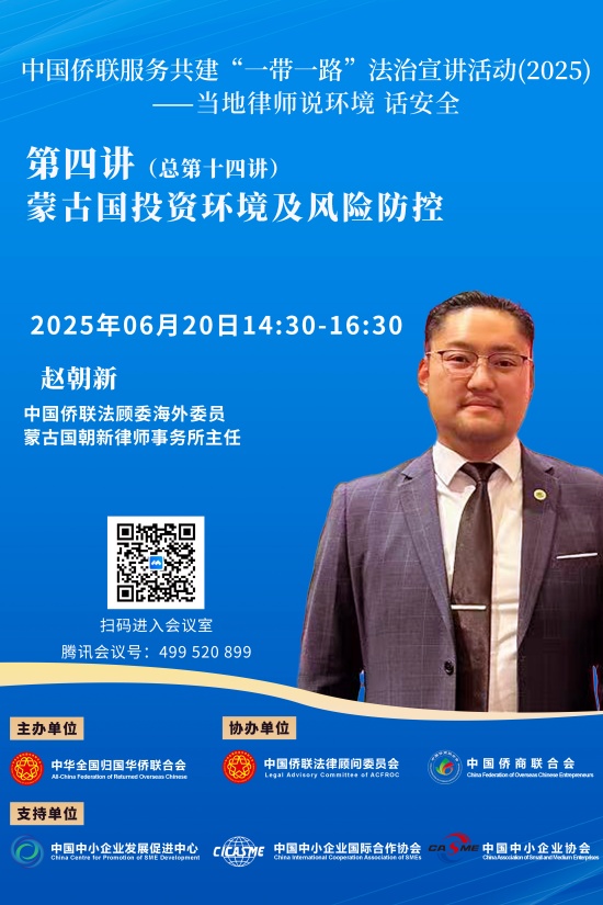 今年第四講(總第十四講)將于2025年6月20日(周五)14:30開播,由中國僑聯法顧委海外委員蒙古國趙朝新律師主講。趙朝新律師1991年出生于蒙古國烏蘭巴托市,2013年畢業于中國暨南大學法學院,后在蒙古國國家行政管理學院進修政府法務管理,是蒙古國目前唯一一位獲得律師資格證的中國公民。趙律師曾擔任蒙古國中國和平統一促進會、蒙古國浙江商會和多家中資企業的法律顧問,2021年創立了蒙古國朝新律師事務所。該律所是蒙古國目前唯一一家由中國公民100%持股、具有從事蒙古國相關法律業務資格的本土律師事務所,為在蒙古國的中國公民和從事礦業、生產業、建筑業、銷售業、金融業等領域的中資企業提供專業、優質的法律服務。