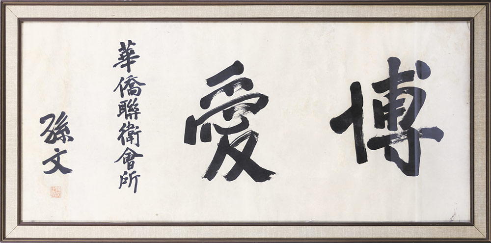 中國華僑歷史博物館收藏的是孫中山先生為南非杜?。炊盘m斯畦?。┤A僑聯衛會題寫的“博愛”。這是現存唯一由孫中山親筆題寫,并且在落款上明示贈予華僑團體的一幅書法作品。題識書孫文二字,鈐印為白文孫文之印。此幅孫中山先生題寫的“博愛”用紙為普通白紙,長103.7厘米,寬50.5厘米,已泛黃,多處蟲蛀,后經重新裝裱修復,但鏡框仍是當年鑲制的,油漆已現斑駁。從書法角度來看,該題詞以唐楷為本,風格端莊質樸,氣息淳厚雋永,筆畫圓融含蓄。