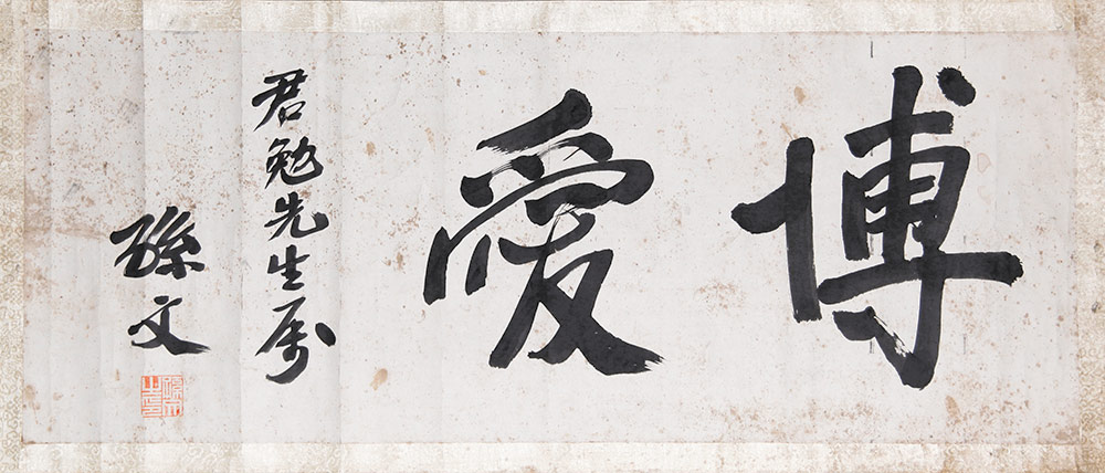 廣東中國客家博物館收藏的“博愛”題詞是孫中山于民國初年在日本題贈給華商潘君勉的,以感謝潘君勉先生多次捐款大力支持民主革命事業,同時借此再次宣傳博愛精神。此書法作品為紙本、橫軸,長98厘米,寬38厘米,整體完整,但霉點嚴重。尾款寫“君勉先生屬”,題識、鈐印皆與中國華僑歷史博物館的“博愛”題詞相同。整幅作品一筆一畫用筆端莊規范,幾無潦草,形體方正,寬博厚重;用墨飽滿,沒有枯筆,棱角圓潤,線條流暢,韻味悠長。