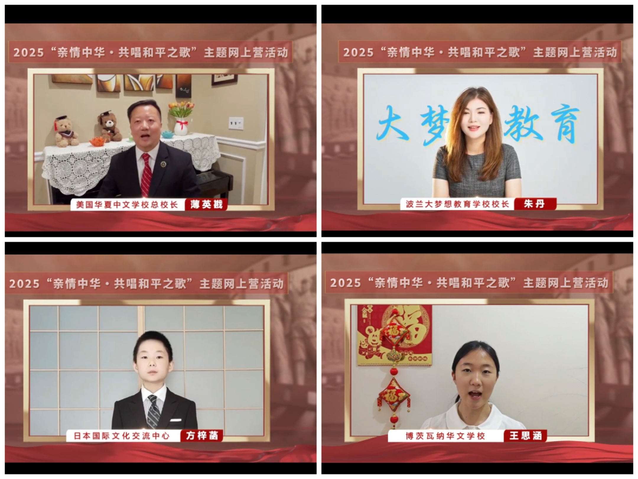 美國華夏中文學??傂iL薄英戡、波蘭大夢想教育學校校長朱丹、日本國際文化交流中心方梓菡、博茨瓦納華文學校王思涵分別作為參營單位和營員代表發言,通過不同角度講述了自己所了解的中國抗戰故事,表達了對弘揚偉大抗戰精神、珍愛守護和平的期待與向往。