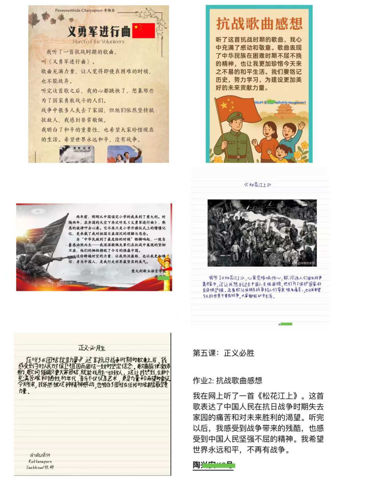 課后,營員們還自發重溫或學唱《義勇軍進行曲》《保衛黃河》《團結就是力量》《松花江上》等抗戰歌曲,并創作提交了豐富多彩的作品,用文字、語言、視頻等描繪和平、唱響未來。