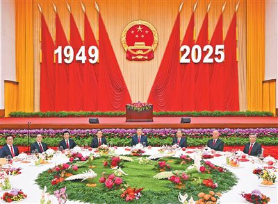 人民大會堂宴會廳華燈璀璨,洋溢著喜慶熱烈的節日氛圍。主席臺上方高懸著莊嚴的國徽,“1949—2025”大字年號在鮮艷紅旗映襯下格外醒目。