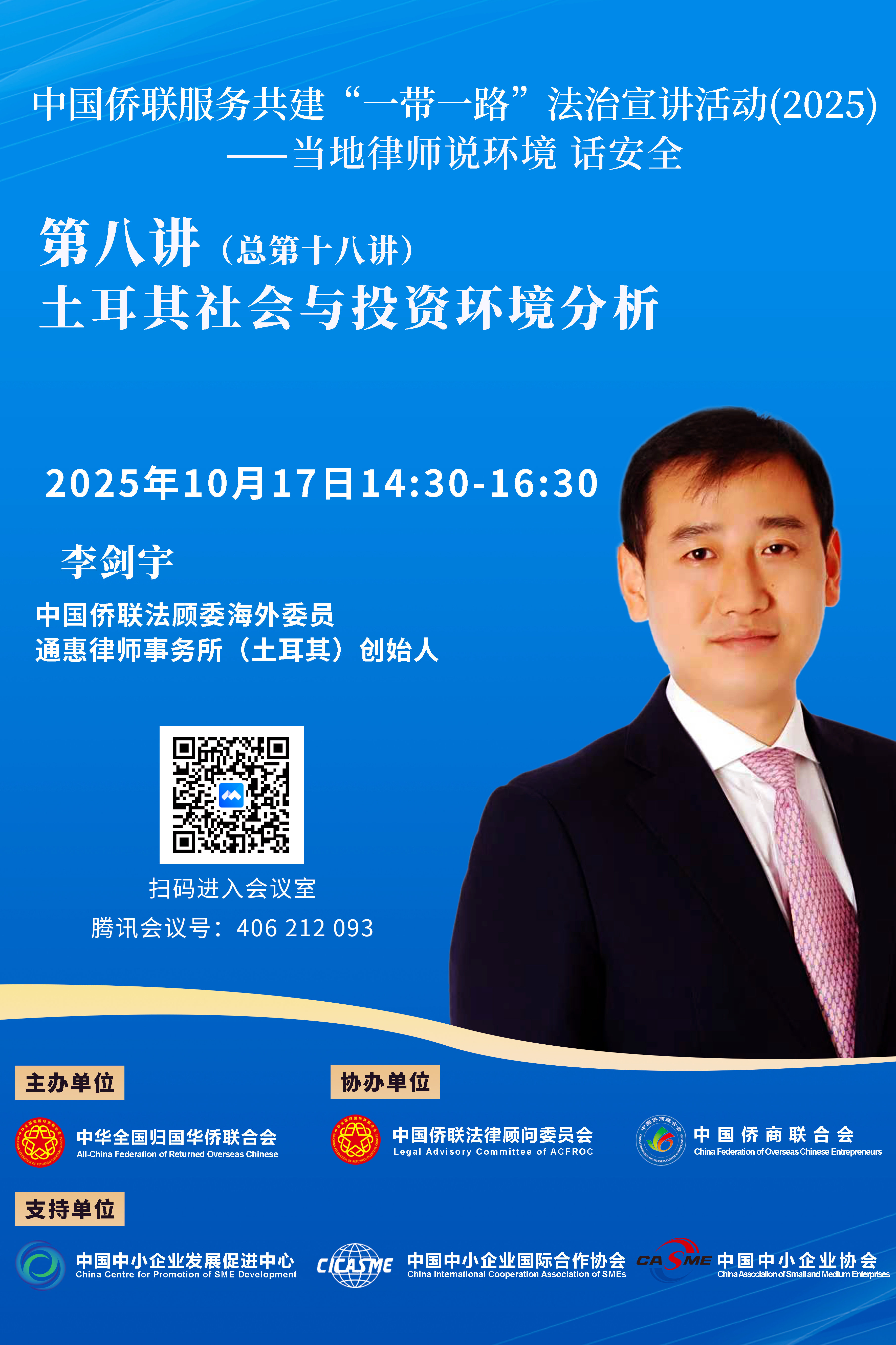 今年第八講(總第十八講)將于2025年10月17日(周五)14:30開播,由中國僑聯法顧委海外委員土耳其李劍宇律師主講。李律師畢業于大連大學,獲國際經濟法學士學位,畢業后先后在競天公誠律師事務所、海華永泰律師事務所、上海復軒律師事務所擔任律師,參與不同企業上市、重組、投資及商業訴訟項目,廣泛接觸各類經濟行業。2020年李律師赴土耳其創辦通惠律師事務所,為廣大中資企業與中國公民提供法律服務,并多次舉辦公益法律服務講座,助力中資企業與中國公民更好維護權益。