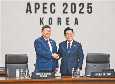 當地時間11月1日上午,國家主席習近平出席亞太經合組織第三十二次領導人非正式會議東道主交接環節,宣布中方將于明年11月在廣東省深圳市舉辦亞太經合組織第三十三次領導人非正式會議。這是習近平同韓國總統李在明在交接環節上握手。新華社記者 謝環馳攝